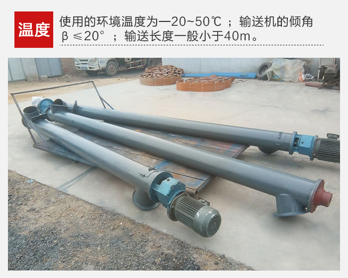2、螺旋輸送機(jī)使用的環(huán)境溫度為—20~50℃ ;輸送機(jī)的傾角β≤20°;輸送長度一般小于40m,最長不超過70m。